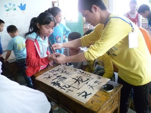 在校长的安排下,宏源书画社成员分成十三个小组,每组2到3人对蓝天小学6个年级的学生开展助教活动,活动主要以教书法、开展学习交流、了解农民工子女日常生活情况等为内容。活动中,书画社成员与孩子们进行了亲密的交流后,便开始指导孩子们如何练习写书法,如何掌握书法的技巧。在书画社成员的耐心指导下,孩子们认真完成了书法写作,并掌握了书法写作的基本技巧??魏?,在与孩子们交流的同时,书画社成员也为孩子们献上笔记本、铅笔等礼物,勉励孩子们好好学习,努力奋斗,长大后为祖国献上自己的一份力量。