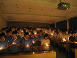 活动开始前,全体师生手捧着点燃的蜡烛,心怀对汶川的感怀和对祖国的感恩之情静静地默哀一分钟。