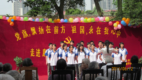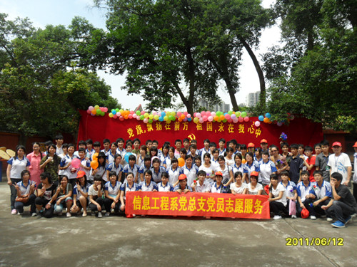 为了弘扬中华民族“尊老爱幼”的传统美德,积极响应“创先争优”工作号召,在建党90周年来临之际,2011年6月12日,信息工程系分团委在廖美暖老师的带领下走进柳州市老人康乐园举行了以“党旗,飘扬在前方,祖国,永在我心中——走进康乐园,关爱老年人”为主题的文艺演出。