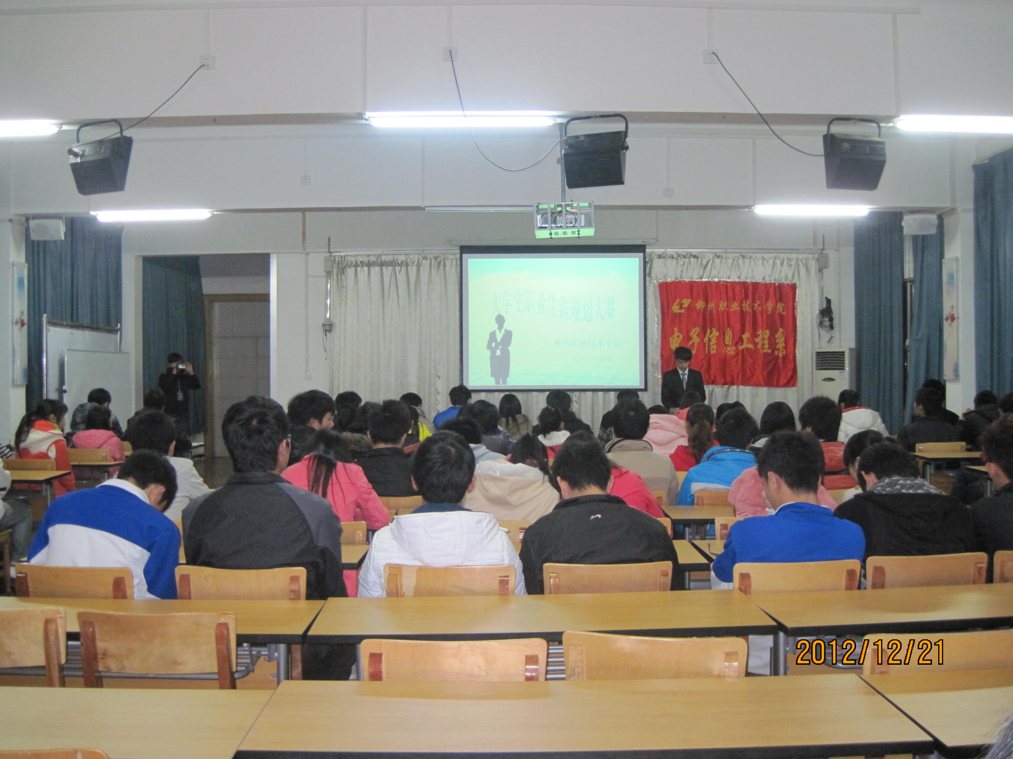 12月21日晚20:00,电子信息工程系在学院德馨楼301教室开展了2012级系部职业生涯规划大赛。此次赛事得到该系领导及老师的指导、支持,出席本次大赛的嘉宾有该系团委学生会主席谢聪南、团委副书记周力、组织部部长覃秋凤等,由10级信管IT班的幸恩华、KAB人事部部长陆艳娇以及获得上届大学生职业生涯规划大赛院赛优异成绩的何广浩同学担任本次大赛的评委,大赛由甘栋同学主持。