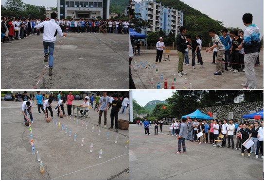 简短的开幕式后,在同学们的期盼中游园活动开始了。本次游园活动分为班级PK赛和个人游戏两个项目。在班级PK赛——纸杯运水比赛时,男女同学搭配,通力合作,一会是手持纸杯蛙跳奋力运水,一会是拍着篮球“S”型前进,出乎意料的情景惹得观众捧腹大笑,一旁的啦啦队则忙着欢呼加油,现场可谓热闹非凡。班级比赛结束后,专门设计的抛砖引“玉”、滚篮球、抛绣球、夹弹珠、青蛙跳水等五个个人游戏项目拉开序幕???,青蛙跳水游戏那正有同学们扎好马步聚精会神地将“青蛙”弹入“水”中;抛砖引“玉”那女生们欢呼雀跃,手持投圈正想法设法引出诱人的奖品;夹弹珠那男生们正屏住呼吸,在水盆里使劲抓住水中游走的弹珠……各个游戏点都是跃跃欲试的同学,乐趣无穷的游戏吸引过往的同学纷纷加入到游戏中来?;疃中肆礁龆嘈∈保谴判巳ざ?,带着欢笑而去,活动取得圆满成功。
