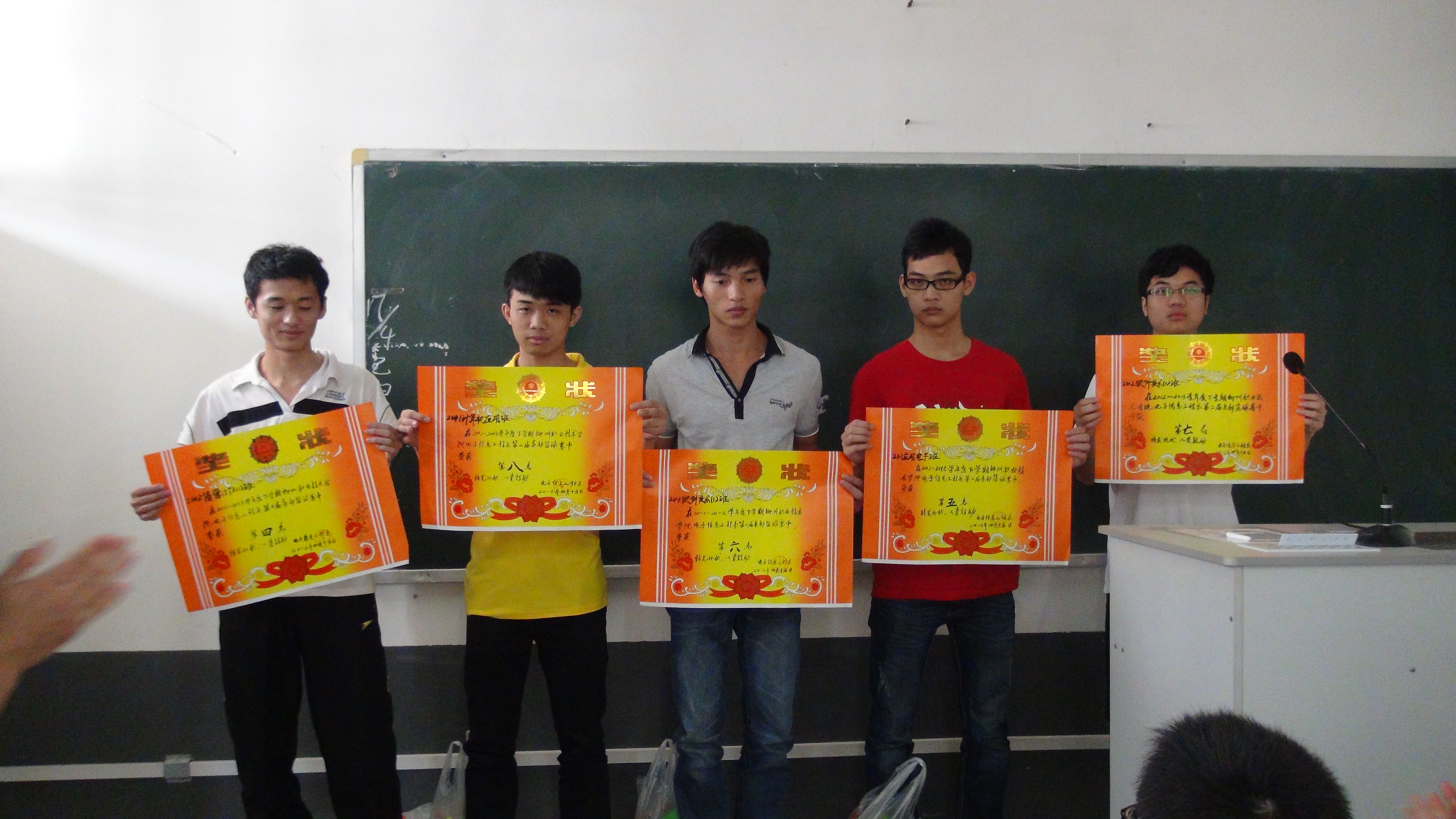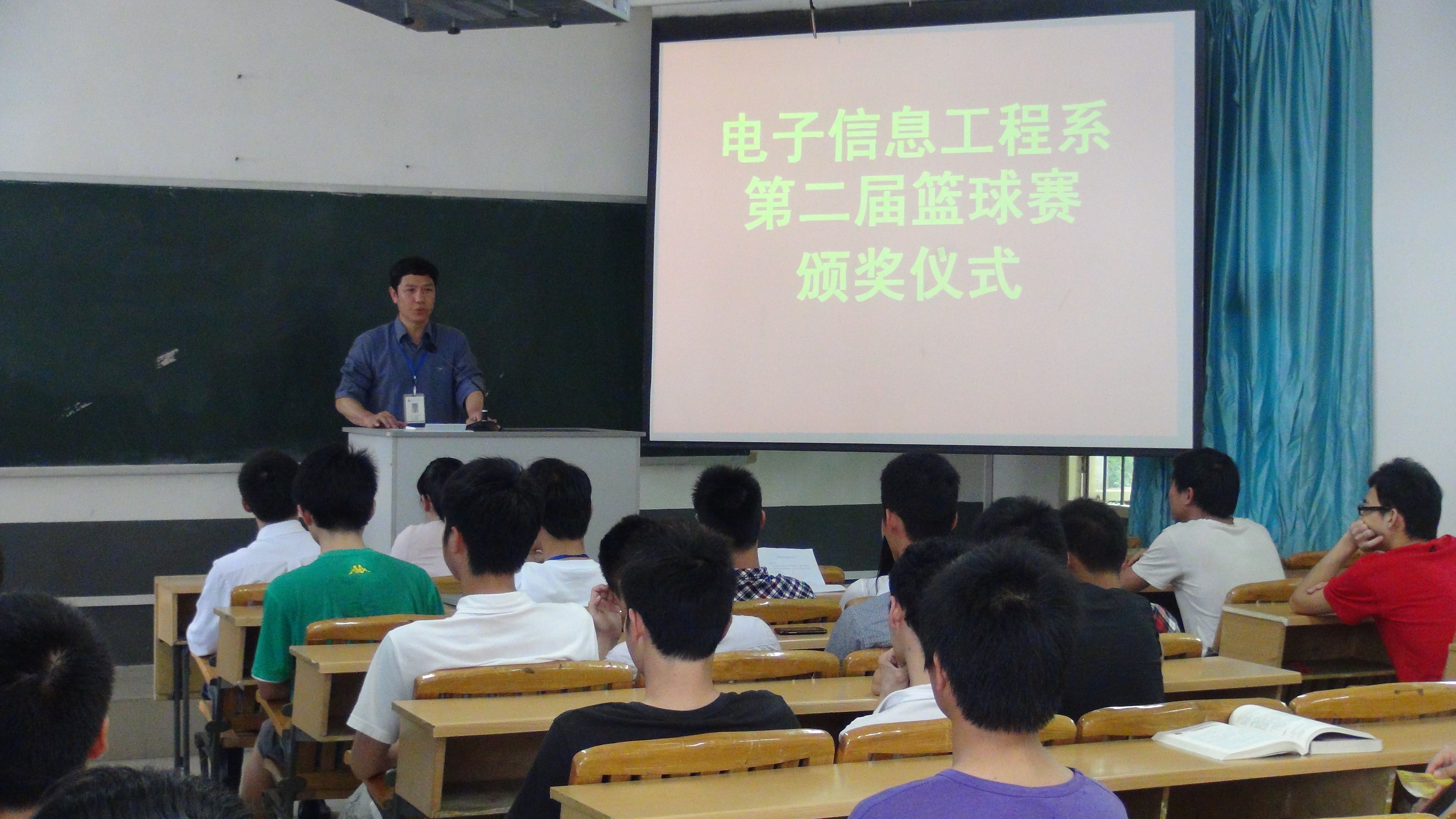 4月18日中午12时10分,电子信息工程第二届篮球赛颁奖仪式于学院本部文华楼104教室隆重举行,该系党总支副书记黎晓灵老师、学生专干杨冬燕老师、分团委书记江恩志老师、学生会主席团和体育部全体成员以及全体球员参加。