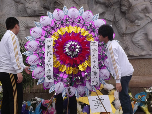 同学们列队怀着崇敬的心情敬献花圈