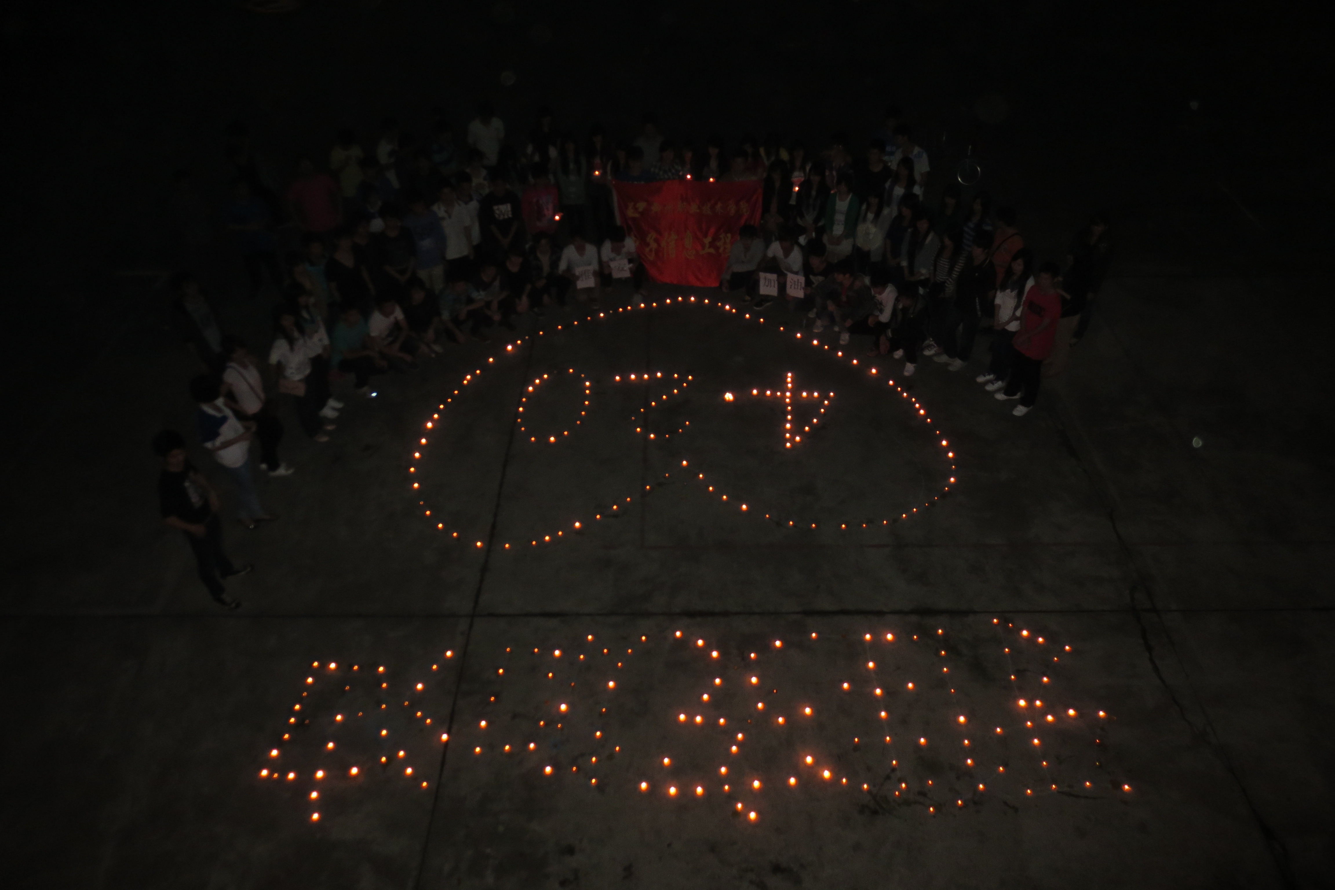 五年前的5.12汶川8.0级地震灾难深深的触动了每一个人的心,五年后的4.20雅安地震再次深深地牵动了人们的心,让人无时无刻不牵挂着雅安灾区的人们,祈福雅安人民能够平安无事,早日脱离困境。同学们点燃“4.20雅安”等字样的蜡烛,为四川雅安地震灾区同胞祈福、加油。“我们与你同在,遥望那看不见的牵挂思念在蔓延,灰色的天空流下眼泪信念被灌溉,你睁开眼看啊繁星在乌云中挣扎,手牵着手我们冲破这黑暗,你睁开眼看啊,看一看身边的爱人,没有什么可以让我把手放开,与你同在风雨中每一天,坚强的信念是梦魇的祭奠,与你同在生命中的每一天,拥抱着明天希望就在眼前,雅安加油!我们与你同在?!蓖歉呱潭磷抛4?,希望大家的祝愿伴着烛光飘向远方,飘向雅安,飘向雅安人民?;疃詈?,同学们发起了三分钟默哀行动,全体同学一起为雅安人民默哀。