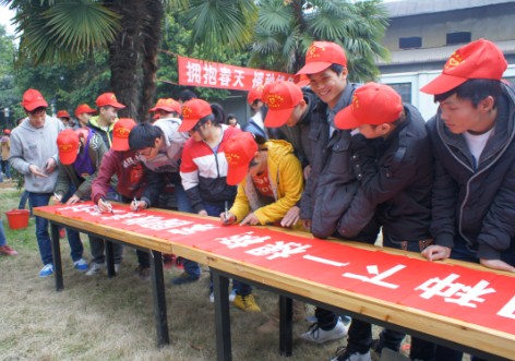 同学们在植树活动宣传横幅下宣誓并在学生会的组织下进行了签名,随后在梁书记、阎科长、各辅导员的亲自带领下展开了本次植树活动?;疃?,同学们带上工具和树苗,积极挖土,各自种下自己班的班级树苗。有些班级的志愿者甚至自制了卡片,许下心愿和系上丝带,挂在了树苗上。
