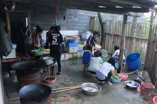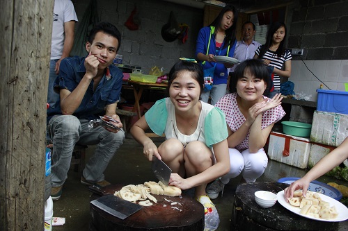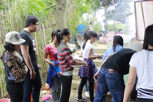 不一会儿,同学们就忙活开了。有的洗菜,有的洗锅,有的打水,可谁会生火?这平时用惯了天然气的同学,难免有些手足无措。最后在农庄老板的帮助下,火终于生起来了。不到 半个小时,香喷喷的回锅肉、可乐鸡翅、咖喱牛肉饭、玉米排骨汤纷纷被端上桌来,面对自己和同学们的辛劳成果,大家吃得很开心。野外聚餐完,同学们还开展了有趣的活动,还参观了农庄的养牛??!
