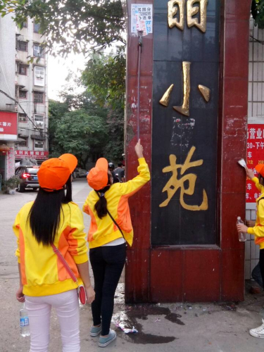 当天下午,45名志愿者们分成两个小分队,一部分志愿者跟随社区负责人到社区的各个小巷进行清扫,地上的果皮纸屑和墙上的牛皮癣一下子就被清除了;另一部分志愿者跟随负责人来到小区的居委会和公众活动场所进行了地板的清洁和清扫等志愿者工作?;疃兄驹刚呙堑玫搅松缜用窈蜕缜涸鹑说母叨热贤驮奚?。