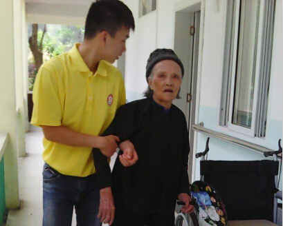 搀扶行动不便的老人走出户外