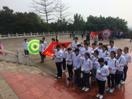 •      早上8点,学生们集中于达理楼前,不久队伍抵达烈士陵园山脚下,苍松翠柏的烈士陵园,寄托着一个时代对数以万计的先烈们的缅怀。先烈们的生命虽已逝去,但他们的精神万古长青,永垂不朽,值得我们永远铭记在心。学生们怀着崇敬的心情,走过长长的云梯,来到烈士纪念碑前,听讲解员诉说着血雨腥风的战争岁月。同学们低着头,为英勇战斗的革命烈士默哀三分钟,表达了对烈士、英雄的思念,并将手中的白花敬献在英烈们的墓碑前。