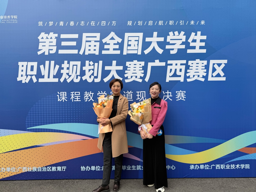 新闻网消息(文、图/通识教育学院 刘珮云)12月5日,第三届全国大学生职业规划大赛广西壮族自治区赛课程教学赛道现场决赛(职教组)在广西职业技术学院圆满落幕。我校由袁诗铭(主讲)、刘珮云、邵丹、许明、潘峰教师组成的就业指导课程团队斩获金奖。由王静(主讲)、卢岚岚、赵泽龙、陈卉教师组成的生涯规划课程团队荣获铜奖。