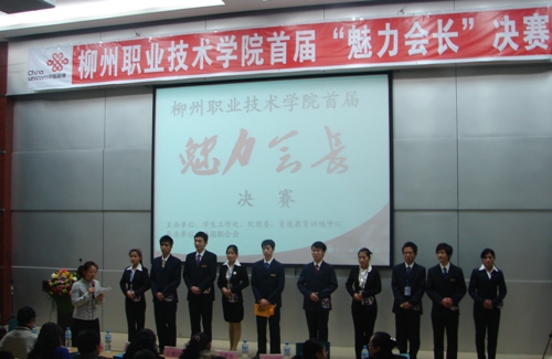 2009年12月29日晚,在岁月即将走进2010年之际,由院学生工作处、院团委、职业素质教育实训基地主办,院社团联合会承办的首届学生社团“魅力会长”评选活动颁奖晚会在南校区音乐表演厅落下帷幕,也预示着我院历时三个星期的首届学生社团“魅力会长”评选活动圆满结束。院学生工作处长梁毅老师、党委宣传部部长左妮红老师、院团委书记杨琳老师、公共基础部副主任陈芳老师、现代教育技术中心副主任刘恒老师、公共基础部唐建老师、招生就业处许明老师等到场观看。