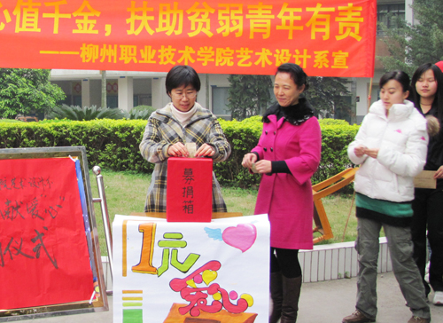 2010年3月12日下午,艺术设计系、音乐系两百多名戴着小红帽的青年志愿者在南校区一号教学楼前列队参加“捐一元,献爱心”活动的募捐仪式,大家都兴高采烈地投下一元钱,全部捐款将用于帮扶柳州市城站社区八户低保孤寡老人和无劳动能力的残疾人。艺术设计系大学生德育课堂和“推优育苗”进社区项目由此启动。