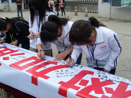 同学们在横幅上签名表达祝福