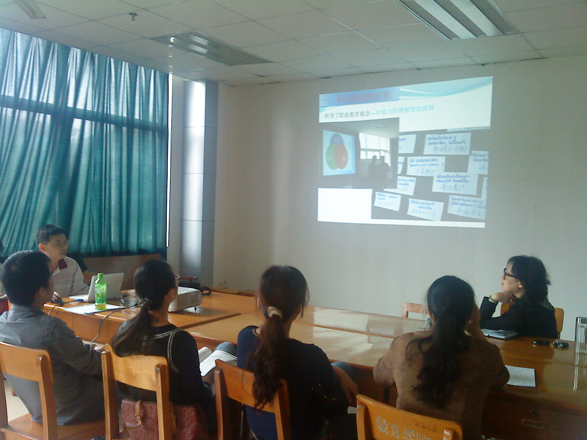 在学习成果汇报会上,黄力老师首先给大家介绍苏州工业园区职业技术学院概况,该院自1997年12月创立以来,积极借鉴新加坡、德国等发达国家先进的职教经验,确立“用明天的技术,培训今天的学员,为未来服务”的办学宗旨,形成了以股份制办学、校企合作、国际交流为特色的办学风格。接着介绍了他们学习和亲身体验的13种行动导向教学法和“六步法”教学过程,通过培训开拓了思维,与参加培训教师之间互相分享,互相交流经验,对转变职业教育能力观念的重要性有了深刻的认识。