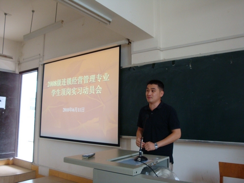 2010年6月11日下午,博闻楼312教室掌声雷动,经济管理系市场营销专业学生顶岗实习经验交流会暨连锁经营管理专业学生顶岗实习动员会在此举行。经济管理系副主任黎渝林、系学生科科长王静、专业教师胡志仁、刘轶宏、学生辅导员牛婷婷参加了会议。