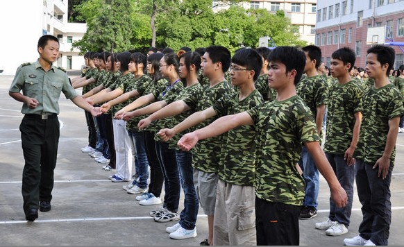 在部队教官亲切的关怀和严格训练下,短短两天内,同学们学习了站军姿、方向变换等预定训练科目。尽管赤日当空、高温闷热,但90后新生们精神抖擞,凭借着顽强的意志及对军训的热情,休息一下便坚持训练。教官手把手地教,学生认真地学,准确地完成教官交给他们的每一个动作,尽管汗珠浸透了衣服,同学们还是鼓足了劲,不让一个小动作破坏整个队伍的整齐与庄严。在接下来的日子,他们将学习跑步行进与立定、齐步行进与立定、坐下起立等训练科目。新生们都想在军训会操中一展军魂,坚定了迎接挑战的决心,勇敢地去迎接军训中遇到的各种困难。