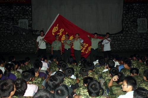 晚上19时,夕阳的余辉还未褪尽,2010级新生们在教官的指挥下,按班级列队站好,等待电影的播放。影片《太行山上》讲述的是八路军总司令朱德同志率领115、120和129三个主力师东渡黄河,挺进抗日前线开辟并建立太行山根据地的故事。影片也吸引了很多大二、大三年级的学生前来观看。