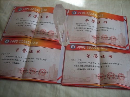学生参加全国石油化工职业院校学生化学检验工技能大赛获奖荣誉证书