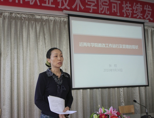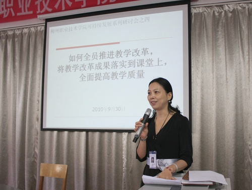 为了夯实学院建设发展基础,反思示范建设过程中存在的问题,理清发展思路,保证学院持续、健康、快速的发展,2010年9月30日上午,我院召开了可持续发展“如何全员推进教学改革,将教学改革成果落实到课堂上”专题研讨会。学院领导、各系部主任、教学团队负责人、骨干教师、行政部门代表以及学院教育学专家代表出席了研讨会。会议由教务与实训管理处处长鞠红霞主持。