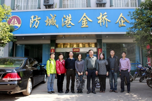 调研第一站是防城港金桥企业。在金桥,调研小组得到了企业邓其龙董事长、卢承珍副总经理、物流公司周明总经理、培训中心吴汉金副主任的热情接待。双方人员就我院经济管理系2009级国际经济与贸易专业、2009级国际物流专业学生到该企业进行顶岗实习的事宜进行洽谈,达成了初步意见,并商定在完善合作方案后签订合作协议。之后,在企业领导带领下,调研小组参观了该企业在校企合作培训实习方面的教学场所和学生到企业后的生活场所。