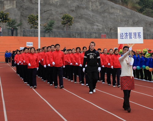 2010年11月17日,在广州亚运会成功举办之际,我院第十二届田径运动会开幕式在学院新落成的运动场上隆重举行。学院党委书记朱伟才、院长石令明、党委副书记阳旭、副院长熊文华、杨毅、张翔、林若森、院长助理李彰汉、敬志轩等学院领导,运动会组委会全体成员在主席台就座,各部门、系部领导,学院全体教职工、全体学生参加了开幕式??皇接裳г旱澄旃抑魅析姆仓鞒帧?br> 上午8点30分,第十二届田径运动会开幕式正式开始。第一方块队——国旗队迈着矫健的步伐入场。紧接着,会旗队、彩旗队、裁判队以及各教职工工会小组方块队、各系学生代表方块队,昂首挺胸,朝气蓬勃,迈着整齐的步伐,高呼响亮的口号,依次走过主席台前,接受检阅。方块队分别展示出精心安排的表演节目,为全院师生展现了各自的特色。他们精彩的表现,充分展现了运动员活泼与积极的良好风貌。其中,学生方块队中的电子电气工程系颇具特色,他们在走到主席台前时,为全院领导、师生展示了精彩的“人与机器共舞”节目,博得了观众的阵阵掌声;机电工程系表演的青春活力舞蹈,也获得了观众的喝彩……阵阵热烈的呼喊声,充满了整个校园,五颜六色的鲜花和彩旗在运动场上形成了一道道亮丽的风景。