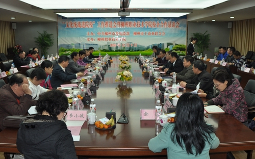 校企合作是职业教育发展的必由之路,也是新形势下学校与企业共同发展的战略选择。本着“政府引导、共同发展、服务社会”的宗旨,继柳州市文化统战进院校示范基地在我院挂牌成立后,由中共柳州市委统战部、柳州市工商联主办,我院承办的“‘文化统战进院?!ぷ魍平狒吡葜耙导际跹г盒F蠛献骺姨富帷庇?010年12月9日下午在我院隆重举行。柳州市工商联刘文光副主席、黄庆芬科长、李伟副科长,学院领导朱伟才、石令明、林若森、敬志轩,柳州市二十余家企业老总和学院统战部、继续教育中心、各系领导出席了本次会议?;嵋橛筛痹撼ち秩羯鞒?。