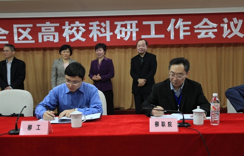 •      4月11日,由自治区教育厅主办、柳州职业技术学院承办的2011年全区高校科研工作会议暨全区高??蒲泄芾碜ㄒ滴被崮昊嵩诹萋≈卣倏?。自治区教育厅副厅长杨伟嘉、自治区知识产权局副局长韦志边、柳州市政协副主席刘向群出席会议,并做重要讲话。我院朱伟才书记、石令明院长、熊文华副院长参加本次会议并陪同与会领导及代表参观考察。全区50余所高校约200人参加会议,会议总结了自治区高校科研工作的成绩和经验,并安排部署了今后一段时期高校科技工作任务。