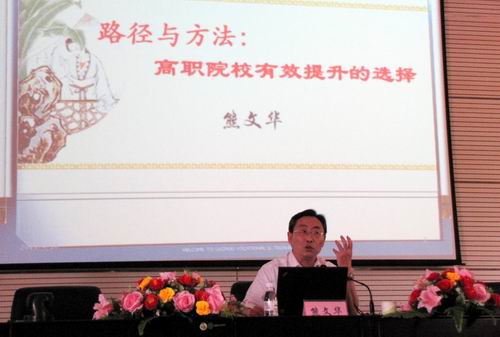 熊文华教授从“认清形式、辨明方向,建立机制、校企合作,改革课程、按需设置,提升师资、组建团队,改善条件、强化实训”等五个方面进行深入浅出地阐述了如何有效提升高职院校综合实力。他认为,高职院校的提升需要围绕“一种机制,三条路径”开展办学,即以建立校企合作的长效机制为基础,从改革课程结构、组建教学团队及改善实训条件等三条路径入手,不断提升学校的内涵和特色建设,最终达到办学实力的有效提升。