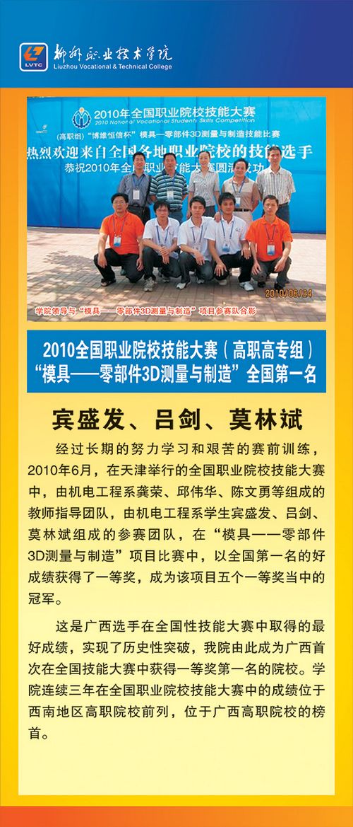 展板图文并茂,色彩亮丽。内容包括荣获2010年全国职业院校技能大赛(高职高专组)“模具----零部件3D测量与制造”全国第一名的机电工程系学生宾盛发、吕剑、莫林斌组成的参赛团队(这是广西选手在全国性技能大赛中取得的最好成绩,实现了历史性突破,我院由此成为广西首次在全国技能大赛获得一等奖第一名的院校。);荣获2010年第四届全国大学生机械创新设计大赛广西区比赛一等奖的机电工程系易良辉同学;荣获2010年第四届全国数控技能大赛广西区一等奖的杨文龙、李冬莲同学;荣获2010年全国3D大赛“爱特恩杯”总决赛二等奖的邓键玲同学;荣获2010年第四届广西数控技能大赛加工中心组第二名的陈明坤同学等获奖学生的照片和先进事迹。