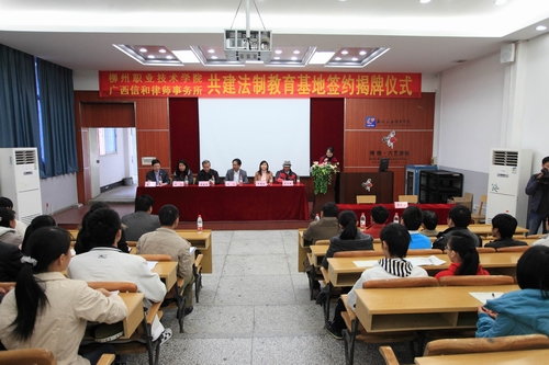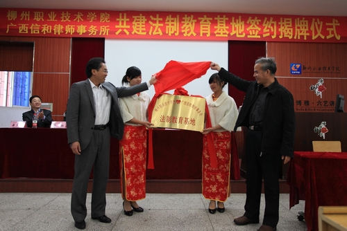 随后,柳州市司法局周建军副局长、阳旭副书记共同为“共建法制教育基地”揭牌,这标志着“大学生法律知识讲座”等一系列法制教育活动的全面展开。