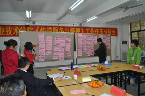 《快递服务与管理》专业工作分析会采用头脑风暴法方式进行,企业专家针对快递服务与管理的工作领域和职业能力进行研讨分析。大家在主持人的引导下,详细地书写了快递行业的各项工作,在此基础上进行分类,畅所欲言,热烈讨论,最后梳理出了快递服务与管理工作的7大工作领域,即“营业收寄、中转运输、派送服务、客户服务、市场策划、运作管理、资源管理”;明确了“收件准备、现场收寄、收寄人信息录入”等20个典型工作任务,并进一步归纳出完成这些工作所需要的职业能力。