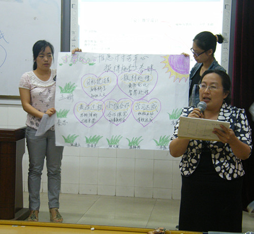 四十六中玉珊校长介绍了在EEPO及“五知”背景下语文课堂小组合作学习有效性的研究情况,她说,在传统的教学模式中学生不能作为学习的主体参与教学,学生的积极情感得不到体验,这直接影响着学生的合作精神与创新能力的培养。她重点介绍了 “小组合作学习”课堂教学模式的操作步骤、小组合作学习应注意的问题,从小组组建、小组合作学习的运作、总结评价三个方面分享了在构建小组合作学习模式研究中的成功经验。