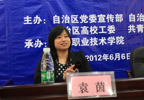 袁茵同志作了题为《以感恩的心回报社会》的报告,讲述了她身残志坚,热心公益,投身文学创作的传奇人生。全国道德模范提名奖获得者袁茵是我院2001届优秀毕业生,现为柳州市鱼峰区委宣传部党务工作者,中国残疾人作家联谊会会员,广西作协会员,柳州市作协副主席。袁茵自幼患上小儿麻痹症,双腿不能行走。她克服常人难以想象的困难,完成了从小学到大学本科学业。袁茵酷爱文学,笔耕不辍,先后创作出版《烽火有情天》等10余部中、长篇小说。工作和写作之余,袁茵长年坚持利用休息时间参与社会公益。2003年8月,她开办了柳州市首个面向全国的个人公益性热线电话——“袁茵热线”,每天利用晚间两个小时及双休日开通热线电话,义务为社会服务,用自己的经历和精神,鼓舞帮助处于困境的人们。袁茵还将其中的典型问题写成文,每周在《柳州晚报》爱心档案专版开设的“袁茵热线手记”专栏上发表。袁茵先后被评为柳州市巾帼建功“十大女杰”、优秀残疾人代表、残疾人“十佳创业之星”、“十佳文明”市民,获得第九届“广西青年五四奖章”、“全区自强模范”,全国“巾帼建功”标兵、“中国青年五四奖章”等荣誉。2008年荣登中国文明网“助人为乐”好人榜。2009年、2011年,被评为全国道德模范提名奖获得者。2012被评为广西青少年成长成才导师。