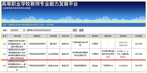 按照《教育部 财政部关于实施职业院校教师素质提高计划的意见》(教职成〔2011〕14号)、《教育部办公厅 财政部办公厅关于做好职业院校教师素质提高计划2011年度项目申报工作的通知》(教职成厅函〔2011〕64号)要求,经各地教育厅推荐,专家评议,第二批拟评定的高等职业学院骨干教师国家级培训项目于6月19日至28日在高职高专教育网进行公示。在培训项目公示中,广西获得三个国家级培训项目,其中一个为我院申报的高等职业学校专业骨干教师国家级培训项目——东风柳汽柳州福臻车体实业有限公司顶岗培训。