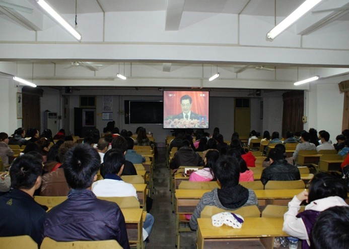 满怀豪情观盛会, 群情振奋受鼓舞。11月8日上午,中国共产党第十八次全国代表大会在北京人民大会堂隆重开幕。这是一个举世瞩目、举国欢庆的时刻,在学院学生工作处、团委的统一安排下,各系分团委、各学生会、学生社团积极组织各级团学干部、团员青年以集中和分散观看的方式,通过中国网络电视直播收看党的十八大开幕式盛况。