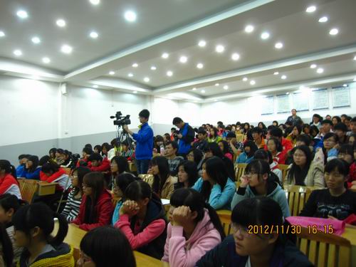 石教授首先结合视频向同学们介绍了服装发展的趋势,精彩的T台表演向将同学们带入了一个五彩缤纷的时装世界。他的讲授不仅专业同时又能够深入浅出。在讲座中,他结合一张张精美的图片,详细介绍了纺织品的三大应用领域,对服装面料的各种材料及鉴别方法以及纺织品成品的生产制造过程娓娓道来,还向同学们介绍了不同衣服布料的保养知识,使同学们了解了不同的服装布料洗涤、去渍和保养办法。石教授严谨、专业又不失幽默风趣的谈吐吸引同学们心无旁骛、专注倾听,不时发出会心的笑声。