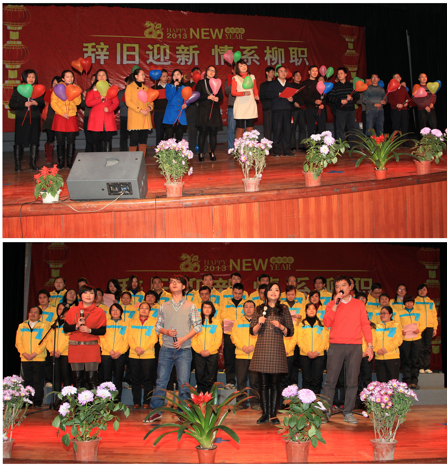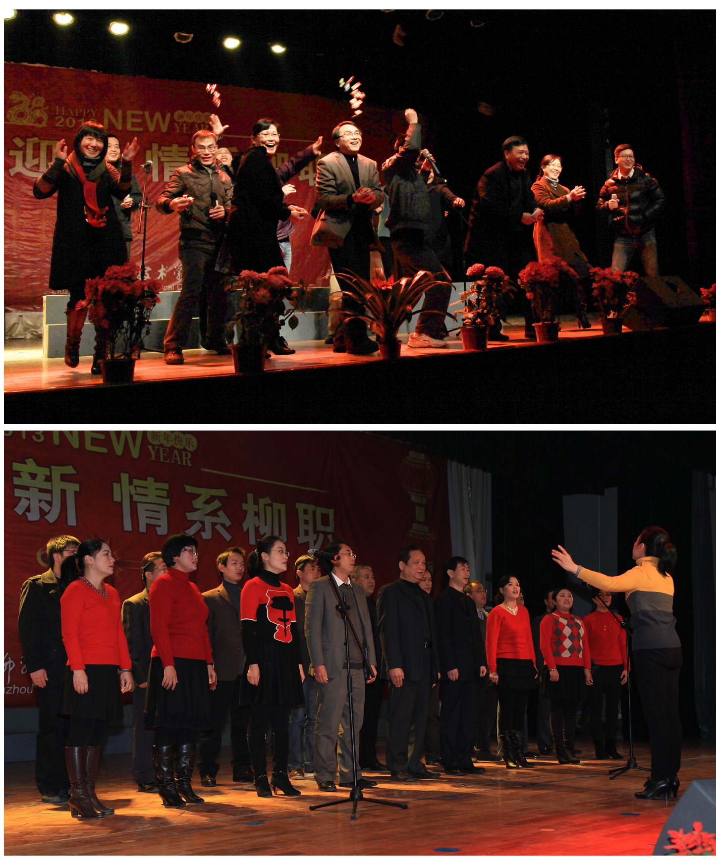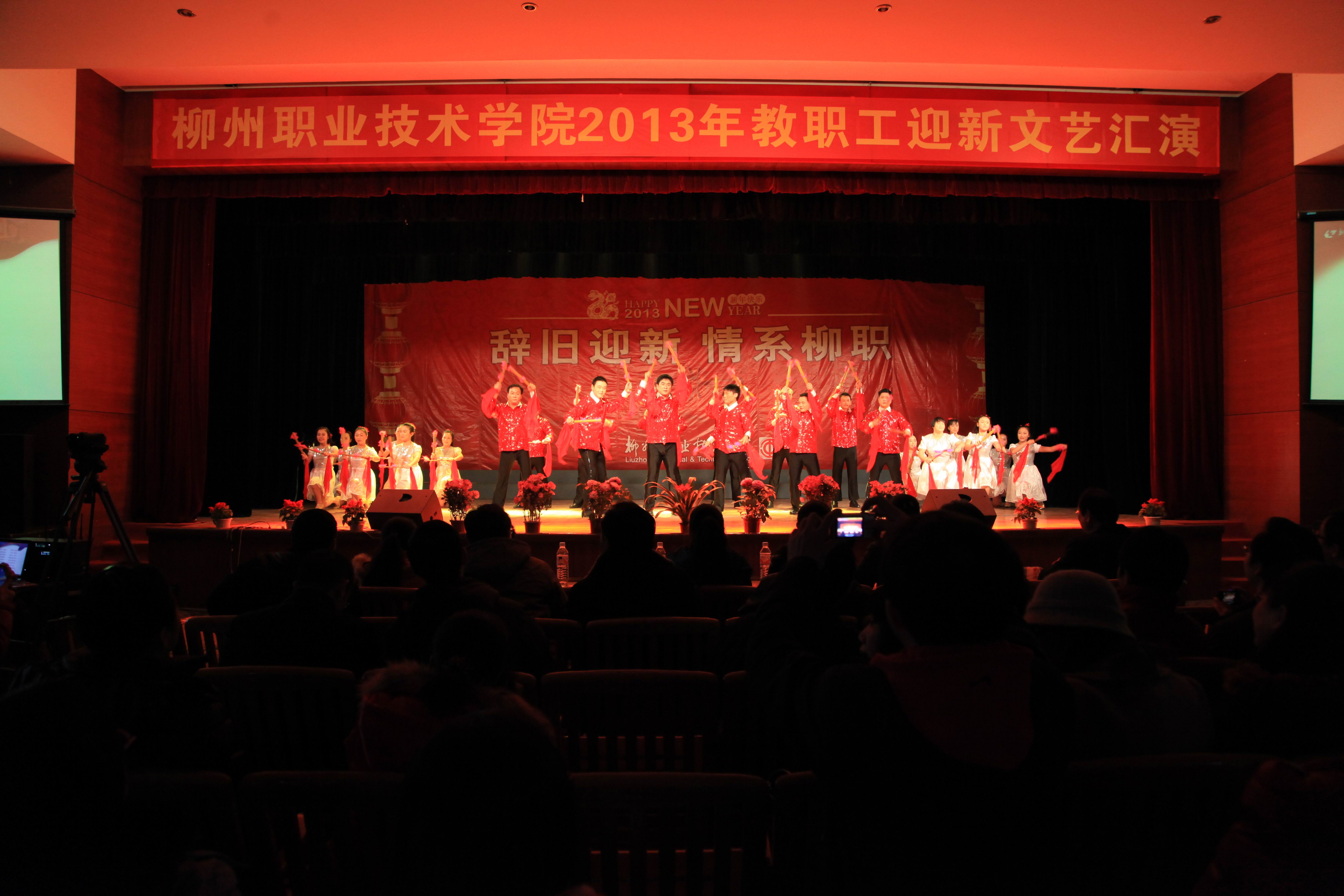 2012年12月31日下午,由学院工会组织的2013年迎新年教职工文艺汇演在南校区礼堂举行,全院15个工会小组依次上演15个精彩节目。精彩纷呈的节目不时迎来阵阵掌声,让广大教职工在经过一年的紧张工作之后充分放松身心。学院领导及部分中层以上干部纷纷上台参演,全院教职工同歌舞,共欢乐,使得本次汇演始终洋溢着祥和与热烈的气氛,充分体现了柳州职业技术学院欣欣向荣的新景象。辞旧迎新,情系柳职。汽车工程系的《花板歌舞-柳职人谱新篇》以独特的艺术视角歌颂了我院的改革与发展,表达了教职工对学院的热爱之情。此次文艺汇演精彩纷呈,为全院教职工献上了一场丰富的视听盛宴。汇演在祝愿声中落下帷幕。
