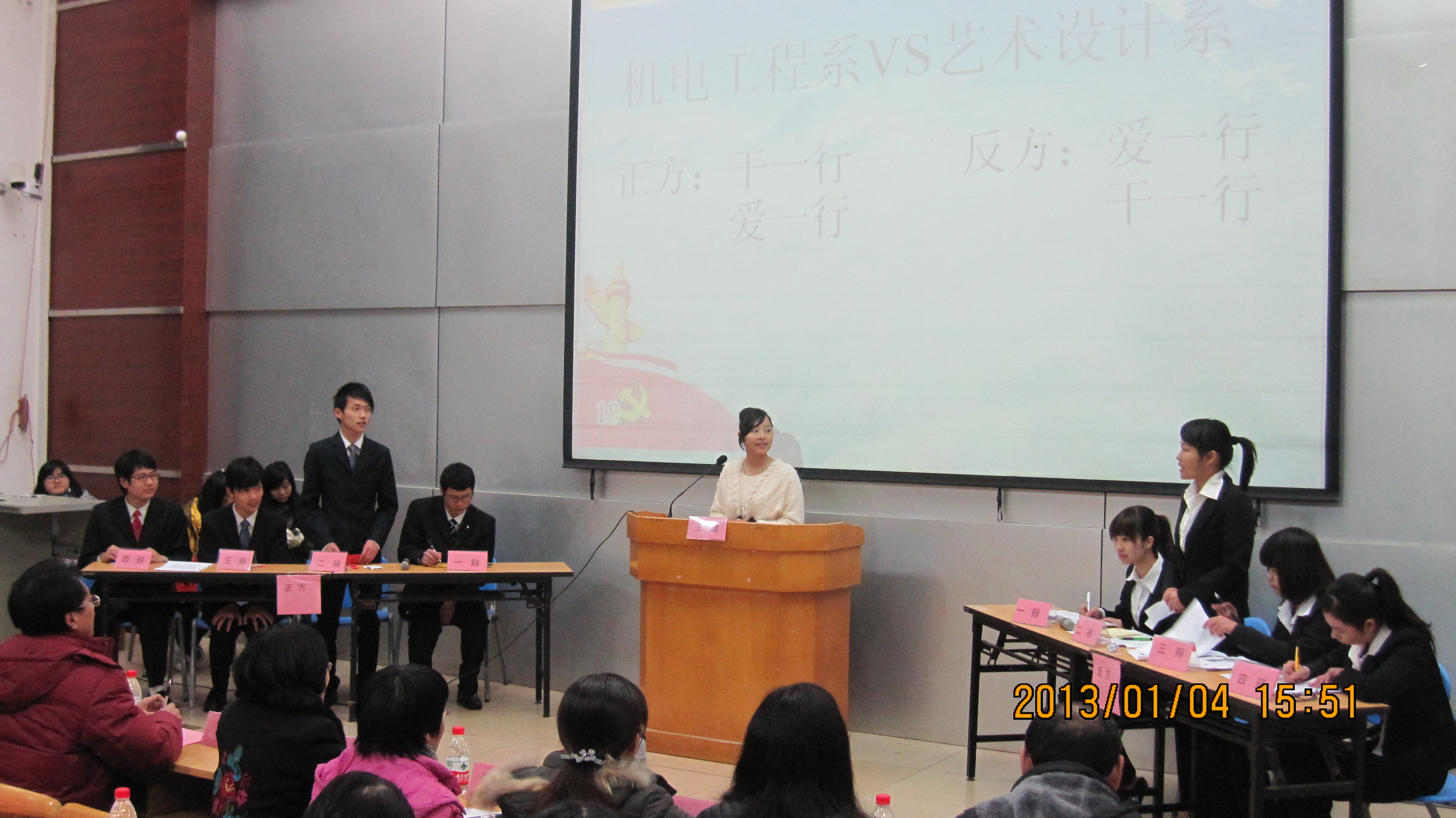 本次辩论赛自2012年12月21日拉开帷幕,经过各系内部的层层选拔,共有7支代表队参赛。经历初赛、复赛和决赛6场赛事的激烈撕杀,机电工程系和艺术设计系杀入决赛。在决赛当天,正方机电工程系代表队和反方艺术设计系代表队分别就“爱一行,干一行”还是“干一行,爱一行”展开辩论。比赛中,辩论双方你来我往、针锋相对、据理力争、步步紧逼、攻防有序,辩手们尽情发挥他们高超的语言技巧,敏捷应对。既有短兵相接的紧张凝重,又有幽默调侃和机智应答带来的欢声笑语,让观众们欣赏到了辩论赛的迷人魅力。辩论中选手们良好的精神风貌、出色的语言组织能力令在场观众为之赞叹。
