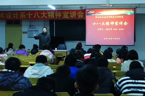 2013年1月7日,学院副院长熊文华教授莅临艺术设计系宣讲十八大精神。熊文华副院长从吹响科学发展的集结号、唱响为人民服务的好声音和激发教育事业的正能量等三个方面阐释了十八大精神。艺术设计系全体教职工及60名入党积极分子到场学习,宣讲会由艺术设计系党总支书记梁毅主持。