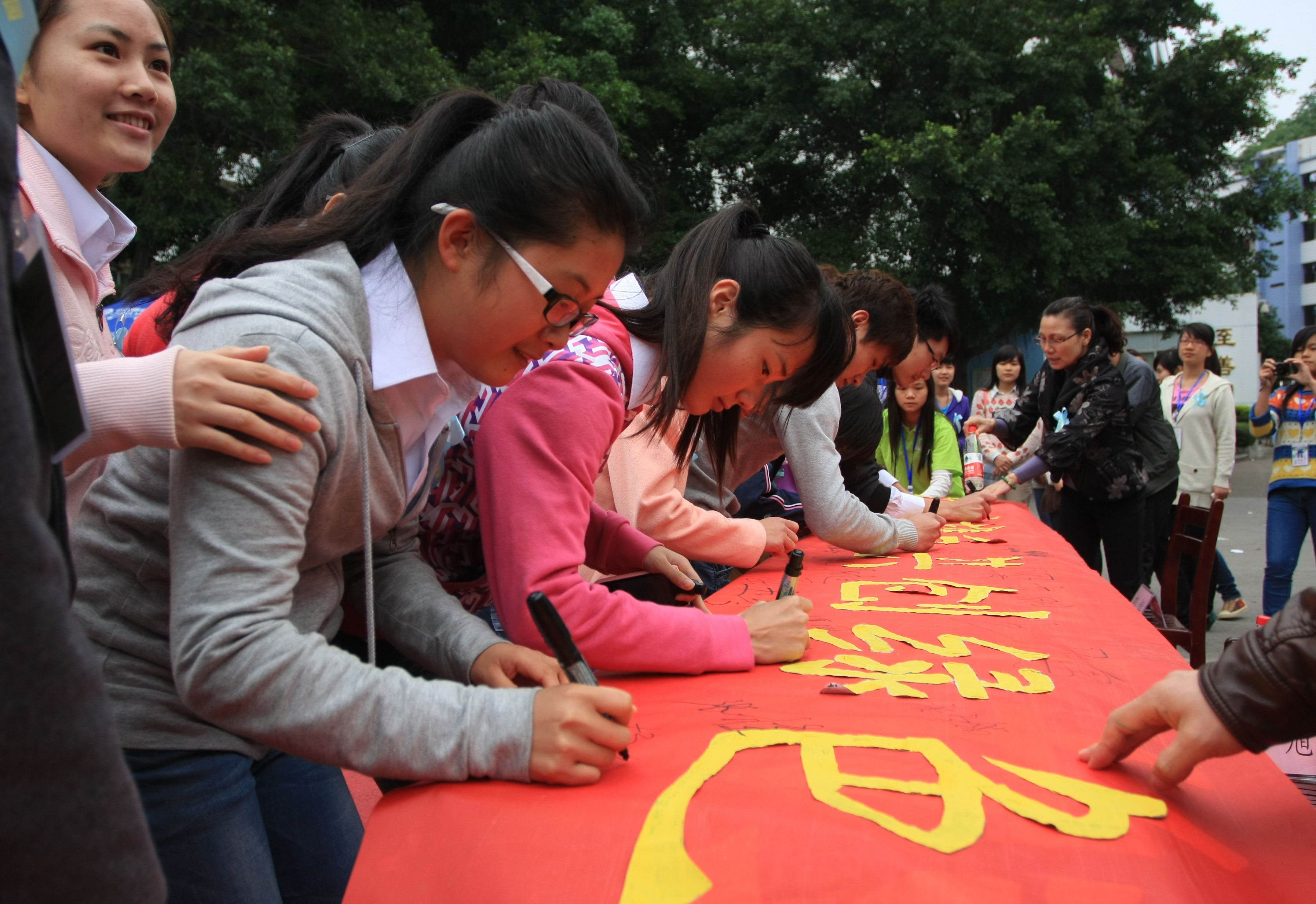 学生在主题横幅上签名