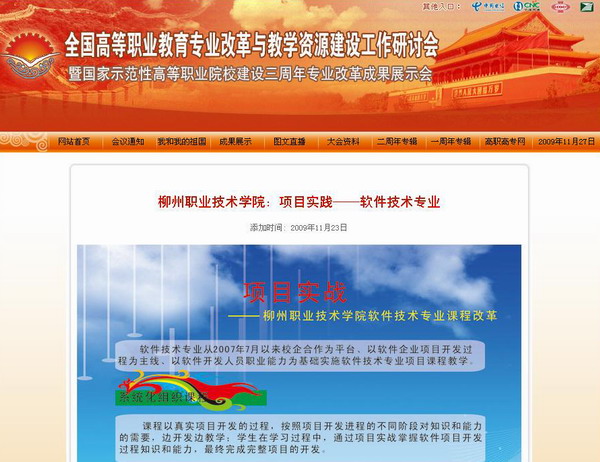 近日,在国家示范性高职院校建设三周年专业成果展示的专题网站,我院信息工程系软件技术专业入选为高职院校专业人才培养模式改革成果展示案例,网站以《项目实战——柳州职业技术学院软件技术专业课程改革》为题,介绍了我院软件技术专业开展的专业课程改革,包括系统化组织课程、项目课程的设计、团队化实施项目教学以及项目教学取得的成果。