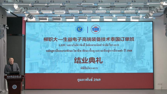 新闻网消息(文、图/机电工程学院 申诗怡)2月9日,柳职大-生益电子高端装备技术泰国订单班结业典礼在官塘校区螺蛳粉产业学院多功能报告厅顺利举行,订单班全体泰国学员圆满完成为期60天的培训并顺利结业。我校国际交流处(港澳台事务办公室)处长韦林华,机电工程学院院长王富春、副院长范然然出席。
