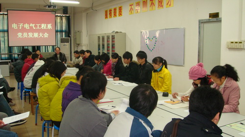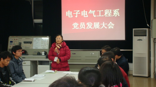 2009年12月17日下午,电子电气工程系党支部在第三实训楼402教室召开了党员发展大会?;嵋橛裳持Р渴榧桥饲炖鲜χ鞒?,电子电气工程系党总支书记伍柳、全体党员以及此次会议发展对象参加了会议。本次大会主要讨论学生辅导员李丽老师和黄金堡等9名同学入党按期转正及陆柄仲等27名同学成为预备党员的问题。