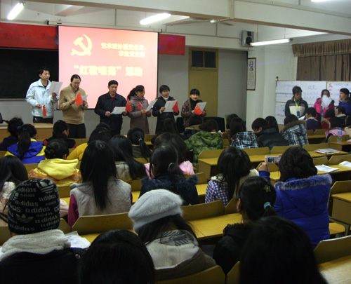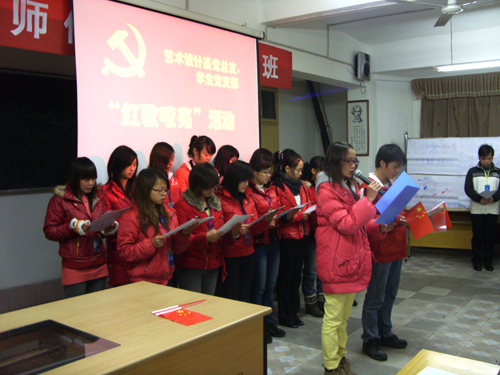 2010年1月8日晚,艺术设计系学生党支部在南校区1-210#教室举办《红歌嘹亮》主题文艺交流晚会,艺术设计系党总支黎晓灵副书记、学生党支部易新亚书记、全体学生党员、入党积极分子、以及2009级向党组织递交了入党申请书的学生、艺术设计系教工党员共180多人参加了晚会。