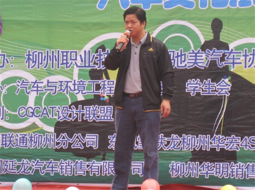 本届汽车文化展由驰美汽车协会主办,为校园社团文化系列活动之一。此次车展吸引了柳州华明销售公司(一汽海马汽车)、柳州延龙汽车销售有限公司、柳州市翔远汽车有限公司、柳州鸿润经济贸易有限公司、东风雪铁龙华宏4S店等汽车经销商参展?;疃戳酥诙喟嫡咔袄垂壅埂O殖』乖黾恿嘶滴璞硌?、儿童舞蹈表演、武术表演以及“遵守交通规则,安全出行”签名活动、车模走秀、模拟营销大赛等多种节目,现场人员热情高涨,尤其现场展出的海南马自达、比亚迪、本田、三菱等多种车型,使他们大饱眼福。