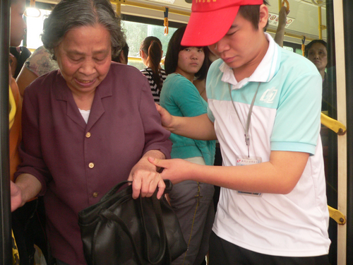 活动开始前,恒达公交车公司胡波副站长希望大家通过这次活动不仅帮助他人,更能体会到作为一名党员应尽的义务。分配到任务的同学都积极认真地做起来。清理站牌的同学顶着烈日工作,脸上渗出细密的汗珠。在车上的同学认真地疏导乘客,委婉地提醒乘客让座。期间有不少乘客向他们投来赞许的目光,还有部分乘客对他们说:“你们是好样的!”