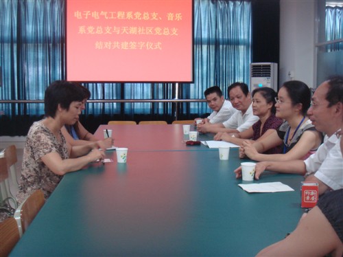 2010年8月2日下午,电子电气工程系党总支、音乐系党总支与天湖社区党总支结对共建签字仪式在竞择楼401举行。参加签字仪式的有电子电气工程系党总支伍柳书记、音乐系党总支吴星副书记、学院机关第五支部韩国云书记、天湖社区党总支周桂琼书记、文雅副书记及电子系、音乐系部分党员,签字协议由电子电气工程系学生党支部书记潘庆老师主持。
