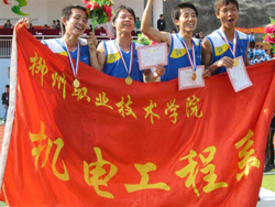 学院第十二届田径运动会已经圆满落下帷幕。运动会中,机电工程系运动健儿发扬团结拼搏、奋勇争先的精神,获得了体育精神文明和体育成绩双丰收。其中,在体育成绩上,共取得8个第一名、8个第二名、4个第三名的好成绩。系体操方块队获得了广播体操比赛第一名,2008数控技术2班的农海凤同学以9.14米的好成绩打破了由她在第十一届田径运动会中创造的8.64米女子铅球投掷记录,2010级数控技术2班由韦明晓、玉定林、陈智健、骆贤伦等4位同学组成的男子4x400米接力队以3分56秒29的佳绩打破了由2004级数控技术3班于2004年创下的3分56秒98的男子4x400米纪录。