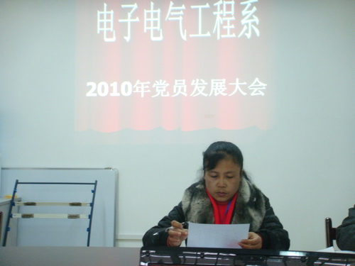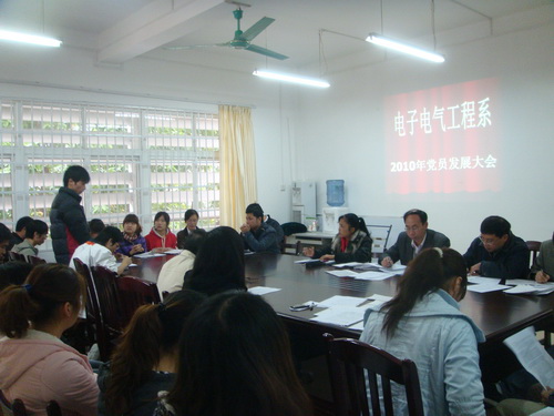 2010年12月9日下午,电子电气工程系党总支部在行健楼电子电气工程系会议室召开了党员发展大会。会议由学生党支部书记潘庆老师主持,电子电气工程系党总支伍柳书记、全体党员以及此次会议发展对象参加了会议。本次大会主要讨论08级和09级共33名同学成为预备党员的问题。