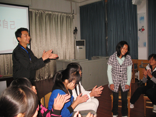 自我探索团体辅导分五个环节,从“知、情、意、行”等四个方面,按照自助与互助、启发与感悟的思路进行阶梯式的活动训练。第一环节的主题是“回顾自我,纵观人生全景图”。先通过“介绍你自己”、“快乐大转盘”、“相亲相爱一家人”等游戏让大家建立友谊,再通过音乐冥想“乘坐时光穿梭机”和“描绘成长曲线图”等活动训练帮助学生唤起成长记忆,了解自我意识发展的全过程,深层次地认识成长经历中的心理创伤问题。